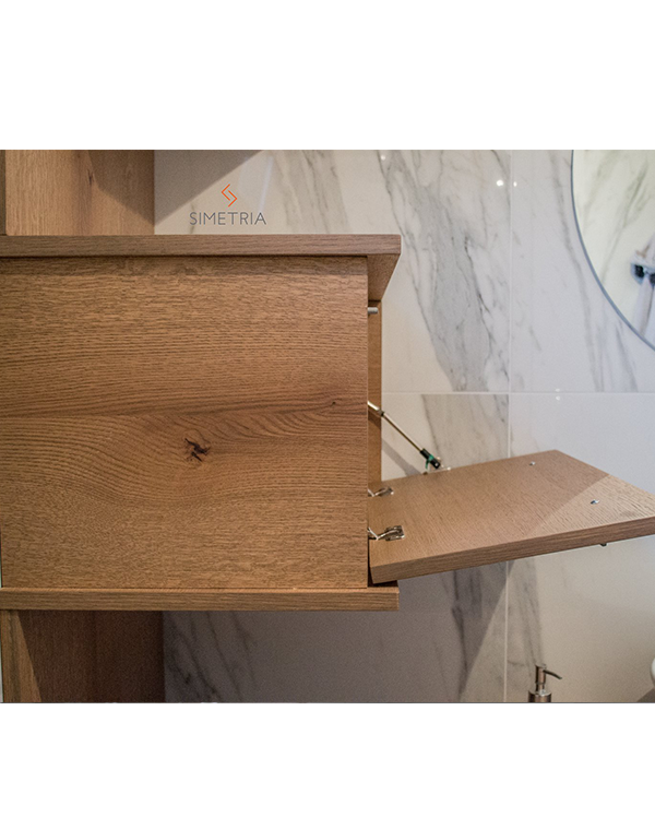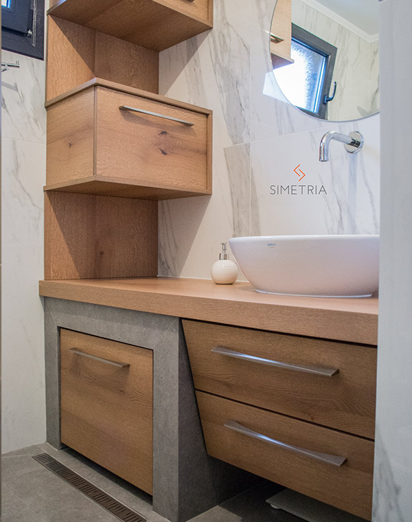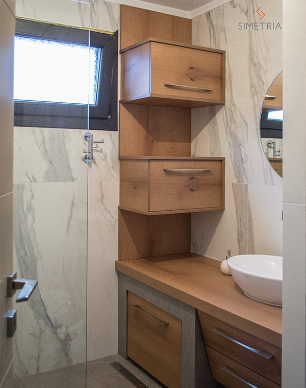 Μπάνιο με χαρακτήρα & πρακτικότητα. Ο συνδυασμός ξύλου και μαρμάρου δημιουργεί ένα ζεστό αλλά και μοντέρνο αποτέλεσμα. Οι διαφορετικές σχεδιαστικές γραμμές – κάθετες, οριζόντιες και λοξές – δίνουν κίνηση και δυναμισμό στο χώρο, ενώ η εργονομία και οι αποθηκευτικοί χώροι εξασφαλίζουν άνεση στην καθημερινότητα