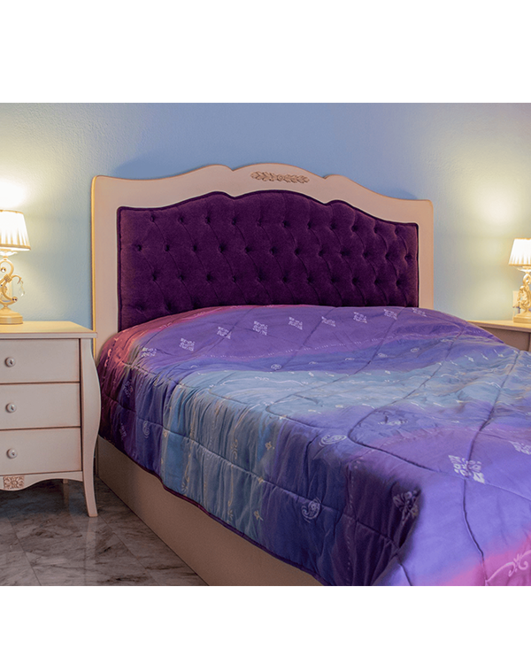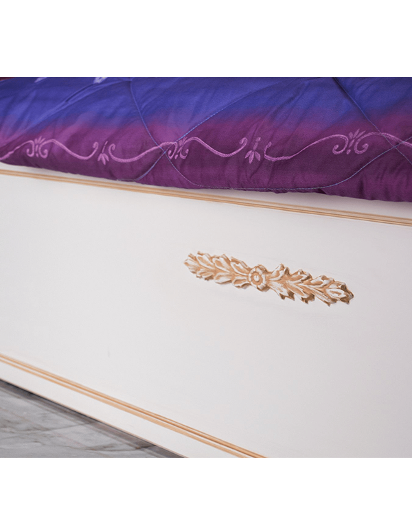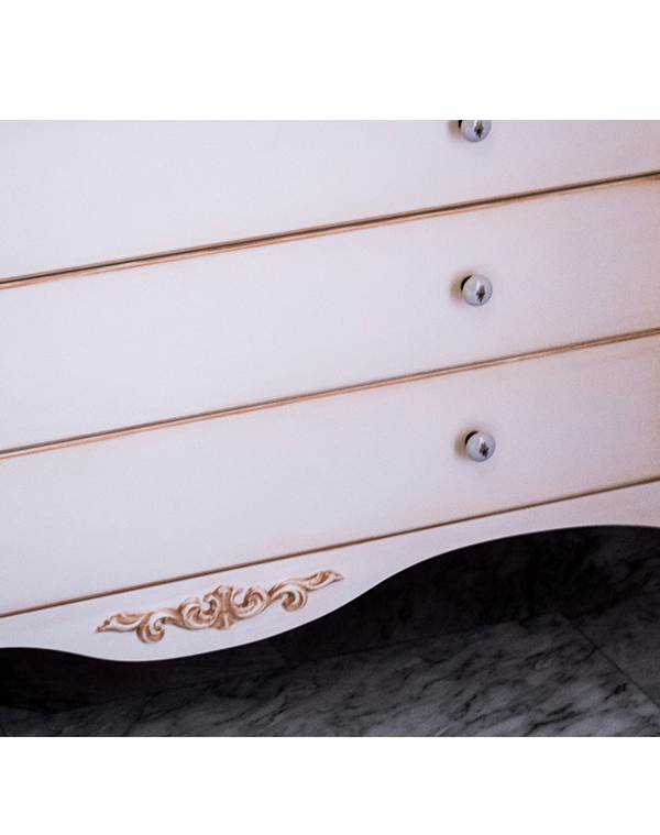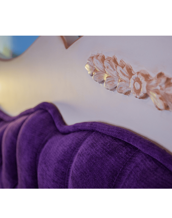 Νεοκλασική κρεβατοκάμαρα σε μπεζ λάκα με χειροποίητη τεχνοτροπία πατίνας. Ο συνδυασμός μπεζ λάκας με πατίνα παλαίωσης σε ροδακινί απόχρωση προσφέρει διαχρονικό χαρακτήρα και υψηλή αισθητική. Το κεφαλάρι με καπιτονέ επένδυση σε μοβ βελούδο προσδίδει μια αίσθηση πολυτέλειας, ενώ η κλασική γραμμή του σχεδίου ενισχύει τον ρομαντικό χαρακτήρα του χώρου. Η ισορροπία ανάμεσα στις ουδέτερες αποχρώσεις και το έντονο μοβ δημιουργεί μια κομψή αντίθεση, καθιστώντας το υπνοδωμάτιο λειτουργικό αλλά και εκλεπτυσμένο. Καθώς κάθε σχέδιο είναι κατά παραγγελία, μπορεί να τροποποιηθεί κατά τη δική προτίμηση και γούστο.